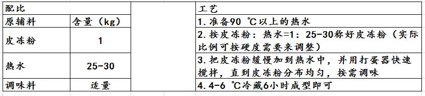 皮冻粉,原料选自进口猪皮胶原蛋白,只需用热水溶开,冷藏即可,皮冻口感Q弹,韧性十足,可用于替代传统熬猪皮,制作皮冻,也可用于汤包、包心丸等需要增加汤汁的产品。